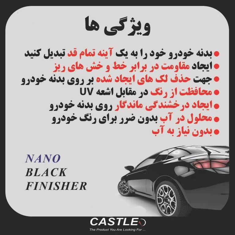 اسپری نانو محافظ رنگ خودرو کستل، یک محصول پیشرفته و مبتنی بر فناوری نانو است که بدنه خودرو را به یک آینه تمامقد تبدیل میکند. این محصول با ایجاد مقاومت در برابر خط و خشهای ریز، لکههای ایجادشده روی بدنه را بهطور مؤثر از بین میبرد.با محافظت از رنگ در برابر اشعه UV، این اسپری از تغییر رنگ و آسیبهای ناشی از نور خورشید جلوگیری میکند. همچنین، این محصول درخشندگی ماندگاری روی بدنه خودرو ایجاد کرده و بهراحتی در آب حل میشود بدون اینکه به رنگ خودرو آسیبی برساند.با استفاده از این اسپری، دیگر نیازی به آبکشی نیست. کافیست محصول را روی بدنه بپاشید، با دستمال بکشید و از درخشندگی بینظیر آن لذت ببرید.این اسپری با ایجاد لایه محافظ قوی و درخشندگی ماندگار، بدنه خودرو را مانند روز اول درخشان و محافظتشده نگه میدارد.