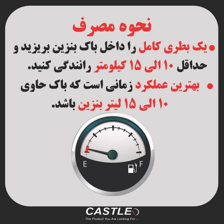 | نحوه استفاده | یک بطری کامل در باک حاوی ۱۰ تا ۱۵ لیتر بنزین اضافه شود. برای تأثیر بهتر، تا پایان بنزین مخلوط شده از بنزین جدید استفاده نشود. قابل استفاده هر ۴ تا ۶ هزار کیلومتر یا در زمان افت شتاب، لرزش موتور یا مصرف بالا |
