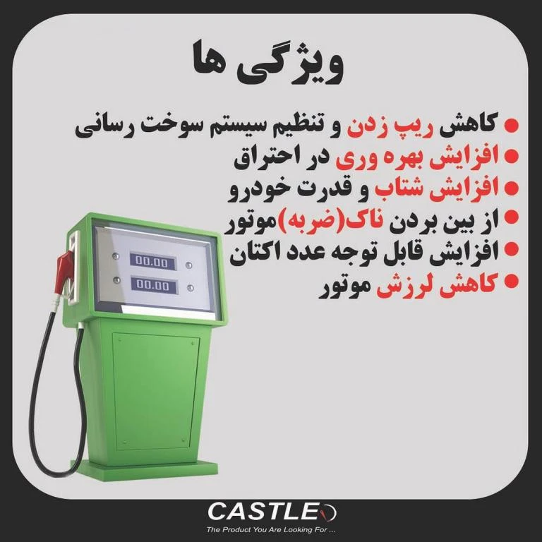 حجم ۲۸۰ سی سی – انتخابی هوشمندانه و مقرون‌به‌صرفه برای خودروهای جمع‌وجور – حجم بهینه برای خودروهایی با باک‌های کوچک‌تر یا بنزین کمتر – فرمول مشترک با مدل E۵۰۰، با همان کارایی در حجم متناسب‌تر – کاهش ناک، ریپ زدن و لرزش موتور در شرایط رانندگی سبک و شهری – افزایش قابل توجه در احتراق، روان شدن موتور و بهبود عملکرد خودروهای اقتصادی – بسته‌بندی پت مقاوم، سبک و قابل حمل برای مصرف سریع و آسان – مقرون‌به‌صرفه برای استفاده مداوم – سازگار با مبدل کاتالیست و سنسور اکسیژن(O۲ Sensor Safe)