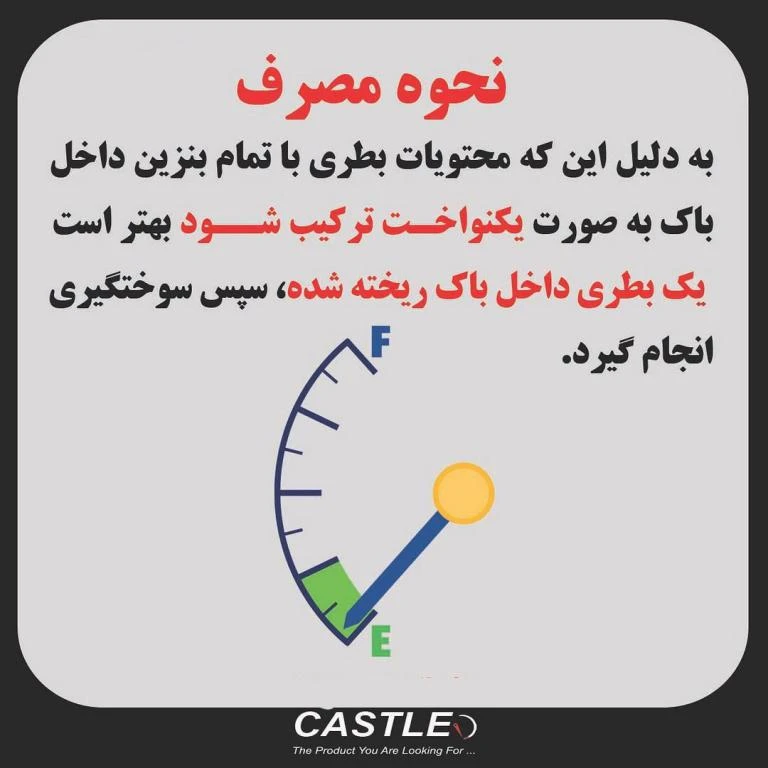 قبل از سوختگیری یک بطری کامل را داخل باک بریزید. سپس بلافاصله سوخت گیری نمایید تا مواد به خوبی با بنزین ترکیب شود. مناسب برای ۲۵ تا ۴۰ لیتر بنزین