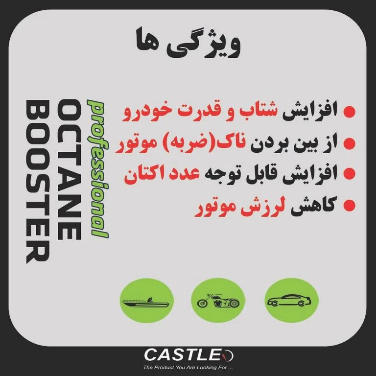 اکتان بوستر کستل مدل Power با حجم ۴۰۰ سیسی، انتخابی ایدهآل برای رانندگانی است که به دنبال تعادلی مناسب بین قدرت، کیفیت و صرفه اقتصادی هستند. این محصول با فرمولاسیونی پیشرفته و قدرت بالاتر نسبت به مدلهای پایه مانند «پرو»، عملکرد موتور خودرو را در شرایط رانندگی روزمره و نیمهسنگین بهبود میبخشد و در عین حال نسبت به مدلهای ردهبالا مانند «اولترا»، قیمتی مناسبتر دارد. افزایش موثر عدد اکتان بنزین، به این اکتان بوستر امکان میدهد تا از بروز ناک (ضربه زدن موتور) جلوگیری کرده و احتراق نرمتر و کاملتری را درون سیلندرها فراهم کند. نتیجه آن، شتابگیری بهتر، کاهش ریپزدن، کاهش لرزش و صدای موتور و در نهایت رانندگی روانتر و لذتبخشتر در انواع خودروهای بنزینی است. بستهبندی فلزی و مقاوم این محصول، آن را به گزینهای مناسب برای مصارف حرفهای و نیمهحرفهای تبدیل کرده و امکان نگهداری طولانیمدت در شرایط مختلف را فراهم میسازد. همچنین فرمول این اکتان بوستر کاملاً با سنسور اکسیژن، مبدل کاتالیست و سیستمهای حساس موتورهای جدید سازگار است و بدون ایجاد آسیب، تنها بر عملکرد موتور تمرکز دارد. برای استفاده، تنها کافیست یک بطری کامل از این محصول را قبل از سوختگیری به باک خودرو اضافه کرده و بلافاصله اقدام به سوختگیری نمایید. این حجم برای ترکیب با ۴۰ تا ۶۰ لیتر بنزین طراحی شده و بهسرعت با سوخت ترکیب میشود تا عملکرد بهینه خود را نشان دهد.