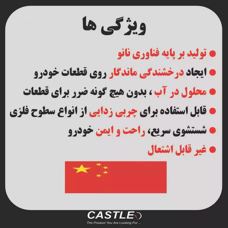 نانو اسپری صفرشوی سطح موتور کستل مدل موتور واش، یک محصول قدرتمند و ایمن برای تمیزکاری کامل و عمیق سطح موتور خودرو است که با فرمولاسیون خاص خود، چربیهای انباشته، روغنهای سوخته و انواع آلودگیهای سطحی را بهراحتی از بین میبرد. این محصول بدون نیاز به آب عمل میکند و با حذف آلودگیها، نمایی تمیز، تازه و حرفهای به موتور خودرو میبخشد.در ترکیبات این اسپری هیچگونه مواد اشتعالزا بهکار نرفته و همین ویژگی آن را برای استفاده بر روی قطعات مختلف موتور، بهویژه پلاستیکی، لاستیکی و رنگشده کاملاً ایمن میسازد. موتور واش کستل برای استفاده روی موتور انواع خودروهای بنزینی و دیزلی طراحی شده و گزینهای ایدهآل برای صفرشویی موتور قبل از فروش خودرو، سرویسهای دورهای یا زیباسازی ظاهر محفظه موتور است.نحوه مصرف این محصول بسیار ساده و سریع است. کافی است آن را به صورت یکنواخت روی سطح موتور اسپری کرده و پس از گذشت چند ثانیه، با یک دستمال تمیز یا فشار باد، تمام آلودگیها و چربیها را پاک نمایید. بدون نیاز به شستوشو با آب، تنها با یک مرحله ساده، سطح موتور درخشان و بدون لکه خواهد شد. نانو اسپری موتور واش کستل، انتخابی هوشمندانه برای کسانی است که به تمیزی، سلامت ظاهری و نگهداری حرفهای از خودرو اهمیت میدهند.
