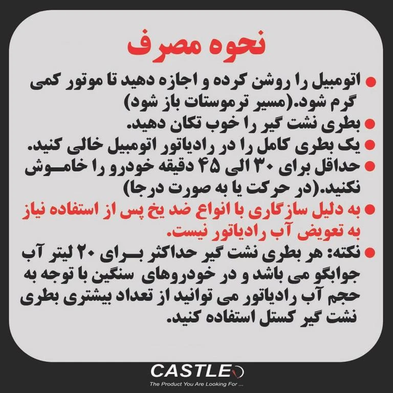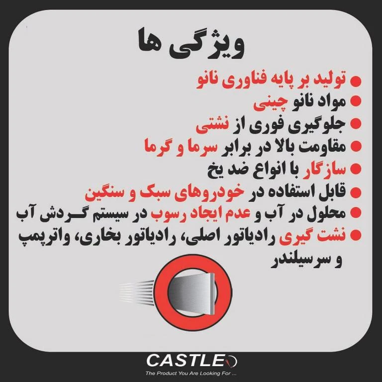 نشتگیر چندمنظوره کستل مدل دکتر رادیات (سری چینی) با بهرهگیری از فرمولاسیون پیشرفته و مشابه نسخه آلمانی، محصولی منحصر به فرد و کارآمد برای ترمیم نشتیهای سیستم خنککننده انواع خودروهای داخلی و خارجی است. این محصول با استفاده از نانوذرات فعال و فناوری روز، قادر است بهصورت سریع و مؤثر نشتیهای رادیاتور، واترپمپ، شلنگها، رادیات بخاری، اویلکولر و واشر سرسیلندر را بدون ایجاد هیچ گونه رسوب یا آسیب به قطعات حساس آببندی کند.بستهبندی این نشتگیر در ظروف پت مقاوم و مجهز به درب ایزیاوپن طراحی شده است که سهولت استفاده، ایمنی و نگهداری راحت محصول را فراهم میآورد. فرمولاسیون محلول در آب این محصول باعث میشود بدون ایجاد رسوب در مدار خنککننده عمل کرده و با انواع ضدیخها و مایعات خنککننده سازگاری کامل داشته باشد. به همین دلیل نیازی به تعویض یا شستوشوی سیستم پس از مصرف وجود ندارد که این موضوع باعث صرفهجویی در زمان و هزینه نگهداری خودرو میشود.این نشتگیر چندمنظوره مناسب خودروهای مختلف، از خودروهای سواری شهری تا خودروهای سنگین و ماشینآلات راهسازی است و با توجه به قدرت و دقت بالای فرمولاسیون خود، ترمیمی بادوام و مطمئن را تضمین میکند. این محصول علاوه بر ترمیم نشتی، از آسیبهای ناشی از کمبود مایع خنککننده جلوگیری کرده و به حفظ دمای بهینه موتور کمک میکند، که در نهایت موجب افزایش عمر مفید قطعات و بهبود عملکرد خودرو میگردد. نحوه مصرف: ۱. ابتدا خودرو را روشن کرده و اجازه دهید موتور تا حدی گرم شود که ترموستات باز گردد. ۲. بطری نشتگیر را به خوبی تکان دهید تا ذرات فعال کاملاً مخلوط شوند. ۳. محتویات بطری را درون آب رادیاتور یا مخزن مایع خنککننده بریزید. ۴. درب رادیاتور یا مخزن را محکم ببندید و موتور را به مدت ۳۰ تا ۴۵ دقیقه، چه در حالت درجا و چه در حرکت، روشن نگه دارید. ۵. پس از استفاده، به دلیل سازگاری کامل محصول با انواع ضدیخ و ضدجوش، نیازی به تعویض آب یا شستوشوی سیستم خنککننده نیست. ۶. هر بطری نشتگیر برای سیستمهای خنککننده حاوی تا ۸ لیتر آب مناسب است و در خودروهای سنگین یا سیستمهایی با حجم بالاتر، میتوانید از چند بطری به صورت همزمان استفاده نمایید.
